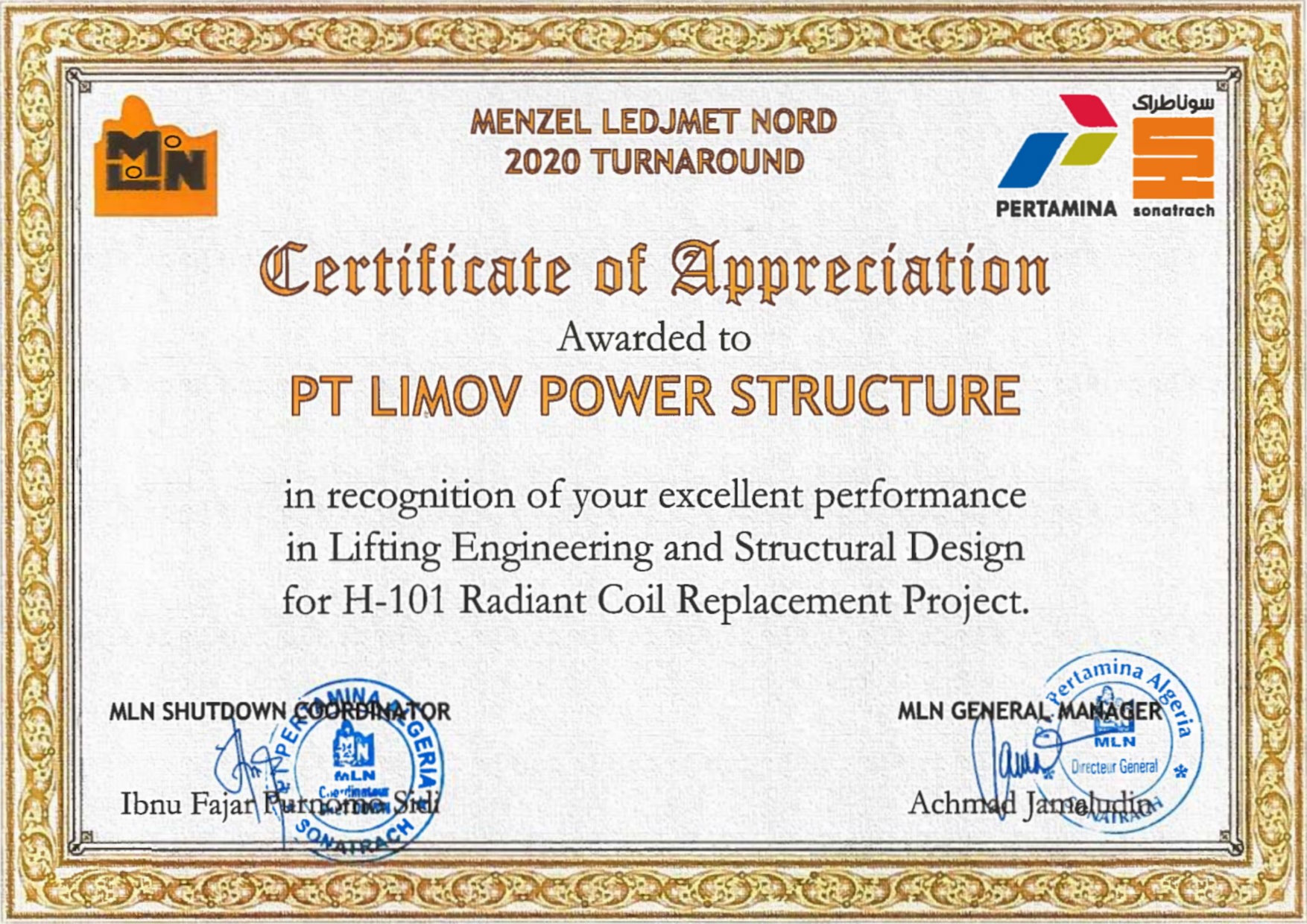 LIMOV Pertamina Algeria Sonatrach MLN H-101 Certificate of Appreciation 1754×85